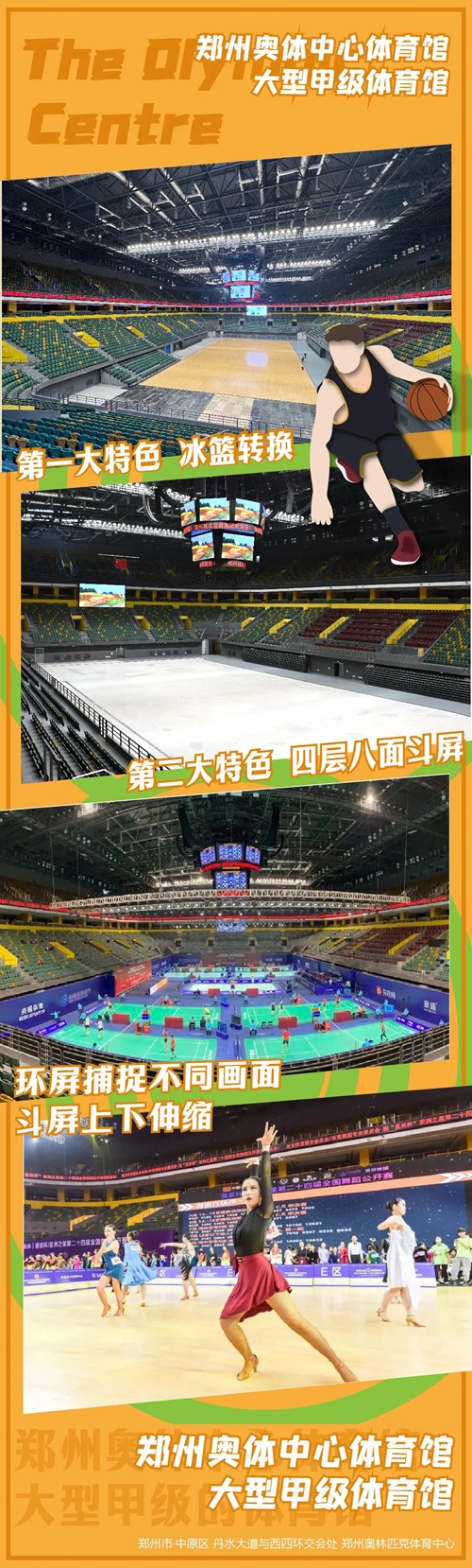 奧體中心體育館作為大型甲級體育館,空間使用靈活,場地利用率高。目前已經(jīng)舉辦了2019年世界乒聯(lián)巡回賽總決賽、2020年世界乒聯(lián)巡回賽總決賽、2019年全國羽毛球單項(xiàng)冠軍賽、2021年全國羽毛球冠軍賽暨第十四屆全運(yùn)會羽毛球項(xiàng)目資格賽、2022年河南省第一屆職業(yè)技能大賽、2023永慶安瀾德云社岳云鵬·孫越相聲專場等知名賽事活動。下半年,將有更多知名演藝、賽事活動在奧體中心體育館舉辦。主館西側(cè)為總面積約2100平方米的籃球熱身館,目前已經(jīng)舉辦過籃球、跆拳道、羽毛球等體育賽事,以及企業(yè)展銷、社區(qū)聯(lián)誼、動漫展等活動;北側(cè)為冰上運(yùn)動中心,擁有1800平方米國際標(biāo)準(zhǔn)冰,致力于為中部地區(qū)提供從啟蒙到精英級的系統(tǒng)化冰上運(yùn)動培訓(xùn)。