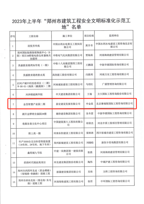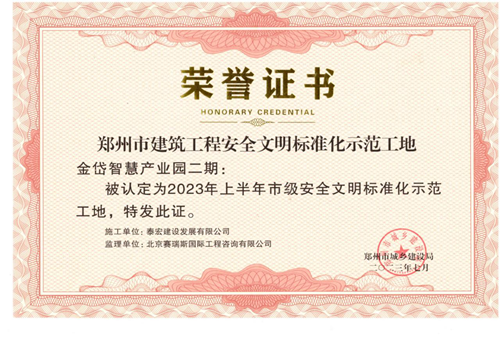 近日,經(jīng)鄭州市城鄉(xiāng)建設(shè)局評(píng)選,河南鄭地科創(chuàng)產(chǎn)業(yè)發(fā)展有限公司投資建設(shè)的金岱智慧產(chǎn)業(yè)園二期項(xiàng)目榮獲“2023年上半年鄭州市建筑工程安全文明標(biāo)準(zhǔn)化示范工地”榮譽(yù)稱號(hào)。