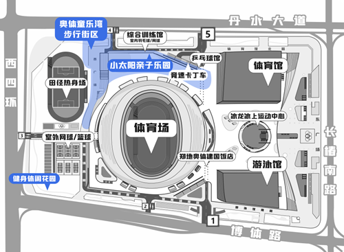 奧體童樂灣步行街區(qū)西鄰田徑訓(xùn)練場,適合開展足球、慢跑、飛盤等親子運(yùn)動,南側(cè)配備有“奧體便民共享便利店”和衛(wèi)生間,向東可直達(dá)體育場二層平臺的“小太陽”網(wǎng)紅打卡地,不僅視野開闊,能一覽各場館建筑風(fēng)貌,還配備了攀爬架、沙坑、秋千等兒童玩樂項(xiàng)目。