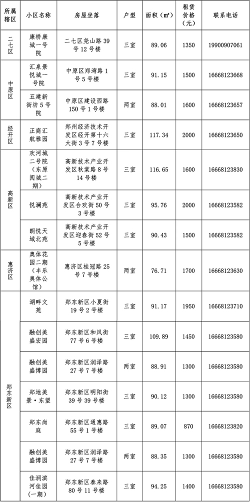 本批次配租房源共計15套(41間),其中為二七區(qū)1套(3間)、中原區(qū)2套(5間)、經(jīng)開區(qū)1套(3間)、高新區(qū)3套(9間)、惠濟區(qū)1套(2間)、鄭東新區(qū)7套(19間)。水電費均為民用水電標(biāo)準(zhǔn),房源精裝修交付,周邊配套設(shè)施齊全,配備家具家電,拎包入住,后續(xù)房源將根據(jù)裝修進度情況陸續(xù)配租,具體以系統(tǒng)實際上線為準(zhǔn)。