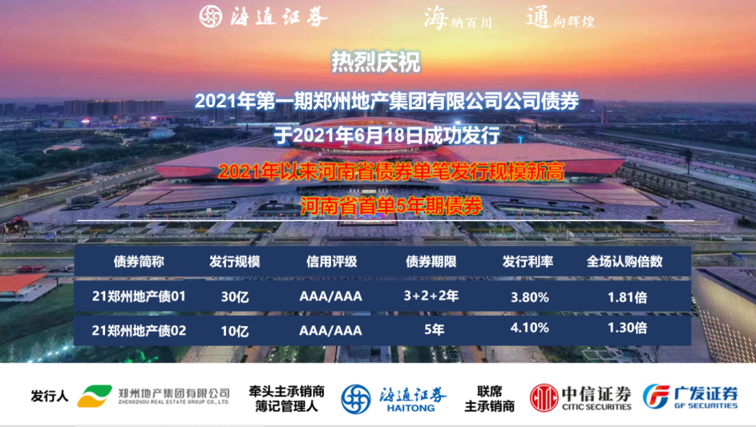 黨史學習教育在鄭州地產(chǎn)集團如火如荼開展,集團黨委在鄭州市委、市政府的領導下,在鄭州市國資委黨委的監(jiān)管下,在學黨史、悟初心的基礎上,將“辦實事、解難題”作為黨史學習教育的重要內(nèi)容,充分釋放黨建紅色生產(chǎn)力,推進黨史教育深入業(yè)務實踐,引領業(yè)務高質(zhì)量發(fā)展。在集團黨委的堅強領導下,鄭州地產(chǎn)集團6月18日成功發(fā)行第一期優(yōu)質(zhì)企業(yè)債券40億元,3+2+2年期產(chǎn)品發(fā)行利率3.8%,5年期產(chǎn)品發(fā)行利率4.1%。本次發(fā)行創(chuàng)河南省首單5年期企業(yè)債券,創(chuàng)2021年以來河南省債券單筆發(fā)行規(guī)模新高,是鄭州地產(chǎn)集團資本市場融資工具的又一創(chuàng)新探索!